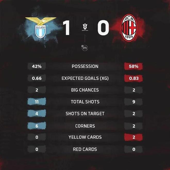 下半场补时5分钟。最终全场比赛结束,拉齐奥1-0米兰。